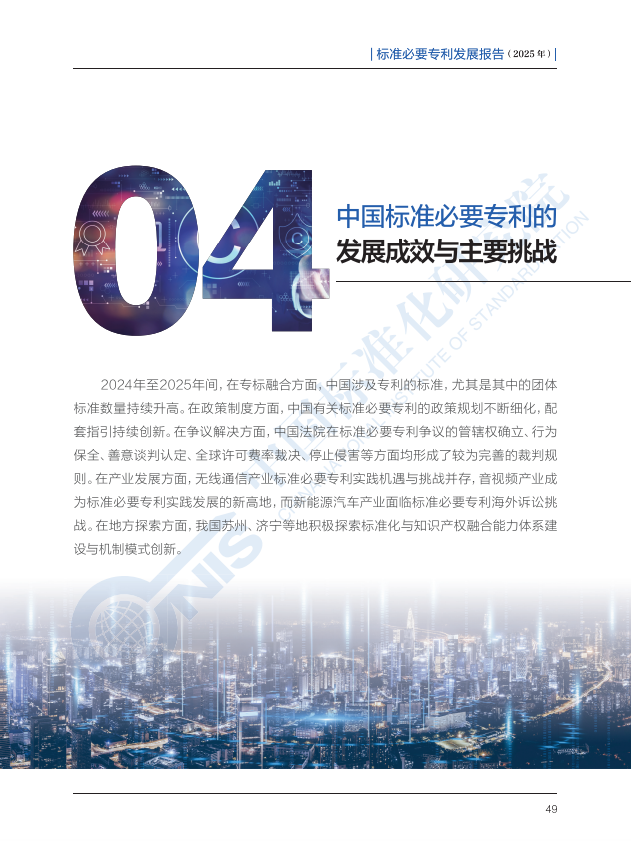 2025年版报告延续并深化了2024年版报告的撰写宗旨与功能定位,面向政府有关部门、社会团体、高等院校、研究机构、企业以及从事标准必要专利相关工作的人员,全面、系统、客观地展现国际国外国内标准必要专利整体发展态势,帮助创新主体更好掌握标准与专利协调创新发展的理论方法。报告共分为五个部分:一是提供标准与专利协同的参考方法。二是梳理主要国际组织标准必要专利实践。三是归纳主要国家(地区)标准必要专利发展态势。四是阐述中国标准必要专利的发展成效与主要挑战。五是提出“十五五”时期标准必要专利发展治理建议。